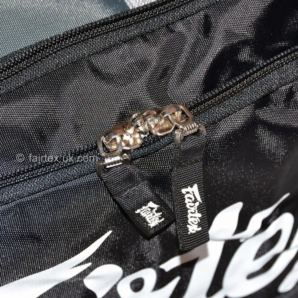 The Fairtex BAG2 Grey Heavy Duty Gym Bag is made from premium grade water-proof nylon. It contains a wet cloth compartment underneath and a large shoe or boxing glove compartment at one end with 2 mesh pockets at the other for a water bottle or other belongings. It also has a headphone socket at top with secure concealed MP3 player/phone pocket on the inside of the top opening. All zips are lockable.
