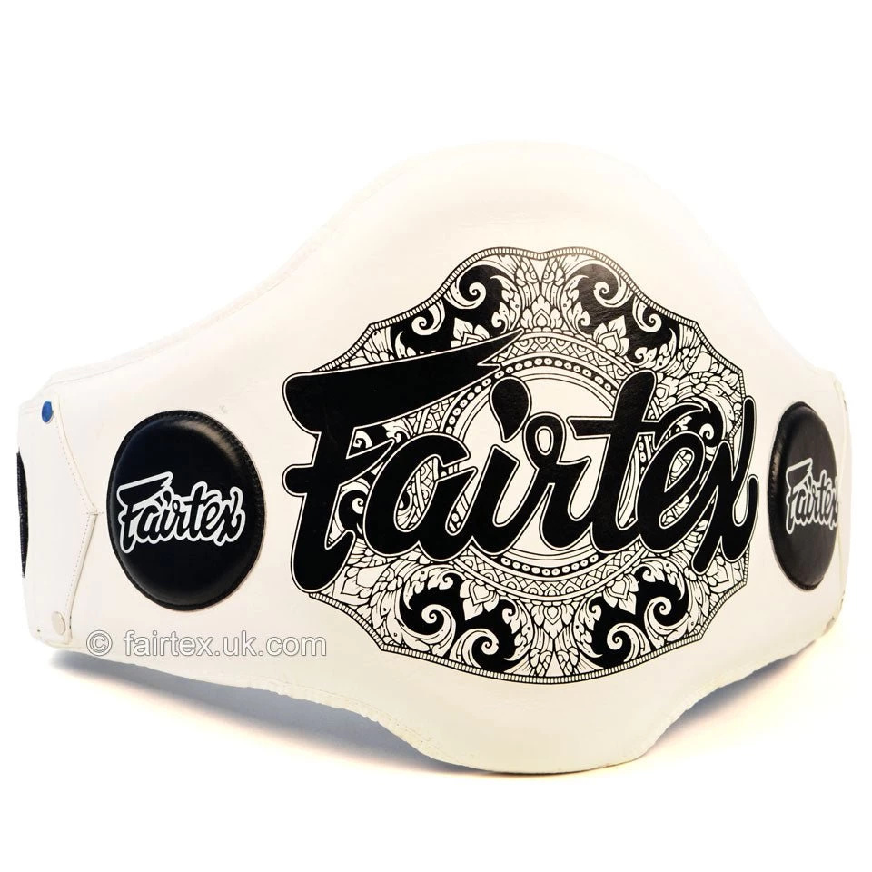 Fairtex BPV2 White lightweight Belly Pad is engineered to protect your abdominal area while allowing you to bring the best in your trainee on front kicks, foot jabs, and knee strikes. It is much lighter than the BPV1 and other traditional belly pads. It is made out of extra strong top grain cowhide leather the Fairtex Belly Pad can last heavy punishment in even the busiest top Thai Gym. It features a new layer of padding and reinforced special plastic inside to cut the weight and increase durability and also enlarged bottom protection to better protect groin area. One single piece of leather with no stitching on the front training area to irritate user. The belt is extra wide for comfort and secure positioning, and is made of AA grade Velcro. This piece of Muay Thai equipment is perfect for practising kicks, knees and other strikes. It is one of the finest Belly Pads for kickboxers and Muay Thai coaches to help train their students. p>