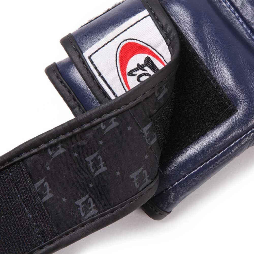The Blue Fairtex BGV15 MMA glove features an open palm design with double wrist wrap hook & loop closure for added wrist support and a secure fit. Perfect for MMA Sparring the Knuckle area contains extra-thick pre-curved high impact foam for ultimate protection against training injuries. Handmade in Thailand the FGV15 MMA Gloves are constructed with a genuine top grain leather shell.