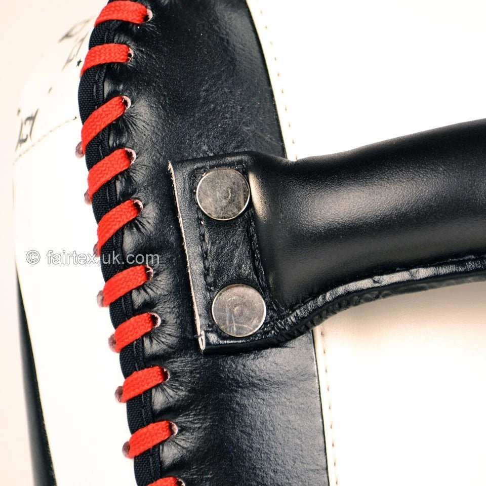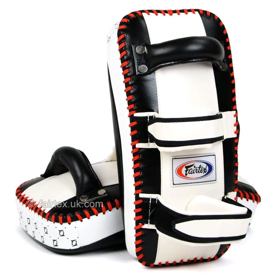 Fairtex Standard Curved Kick Pads offer a target based experience in training. With two leather straps and handle, these are slightly less bulky than the generic Muay Thai pad. These are ideal for smaller fighters or coaches looking to teach their students accuracy. These are excellent quality as usual from the biggest brand in Thailand, Fairtex. The padding is thick despite their size and they will absorb strikes perfectly. Because of the curvature these fit to a trainers forearm and also give a light worn in feel immediately.