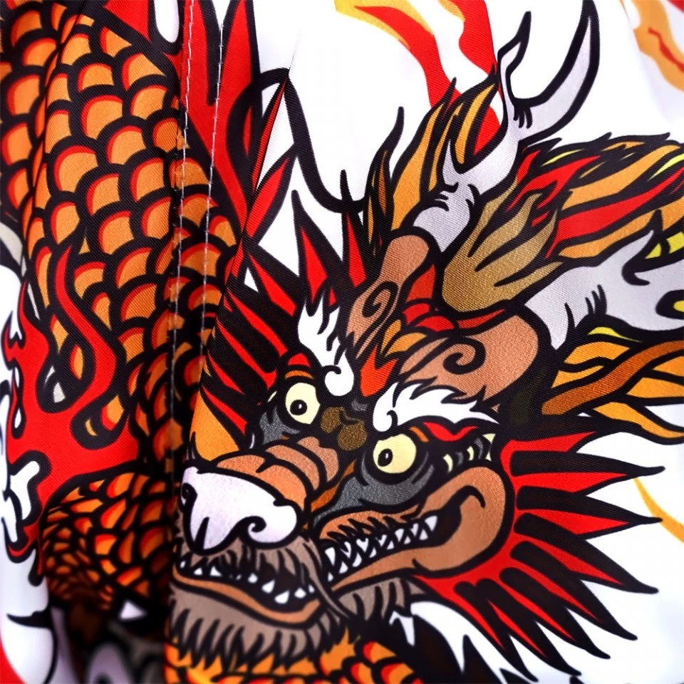 The Chinese mystical dragon dashing through the white clouds. The retro-style boxing shorts also have a Chinese word that means “dragon” printed on it.