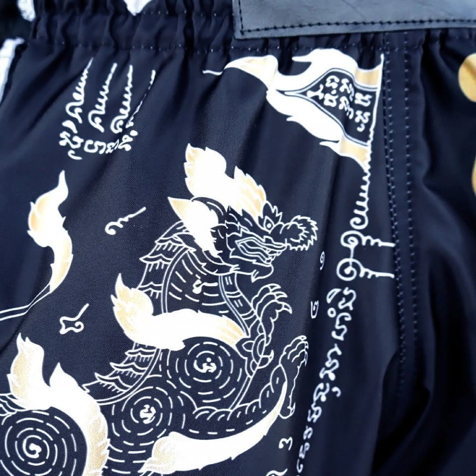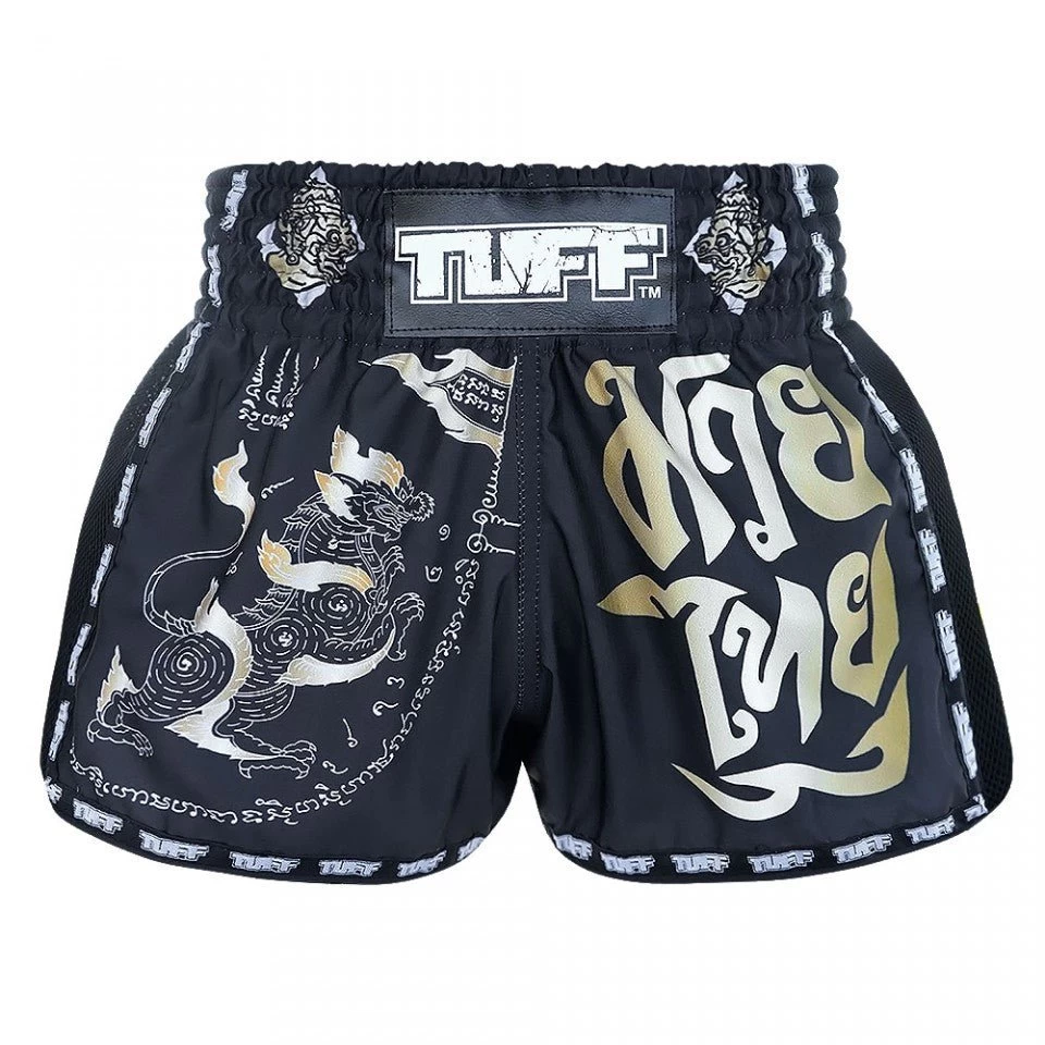 MRS206 TUFF Muay Thai Shorts Retro Style Black Singha Yantra with War Flag