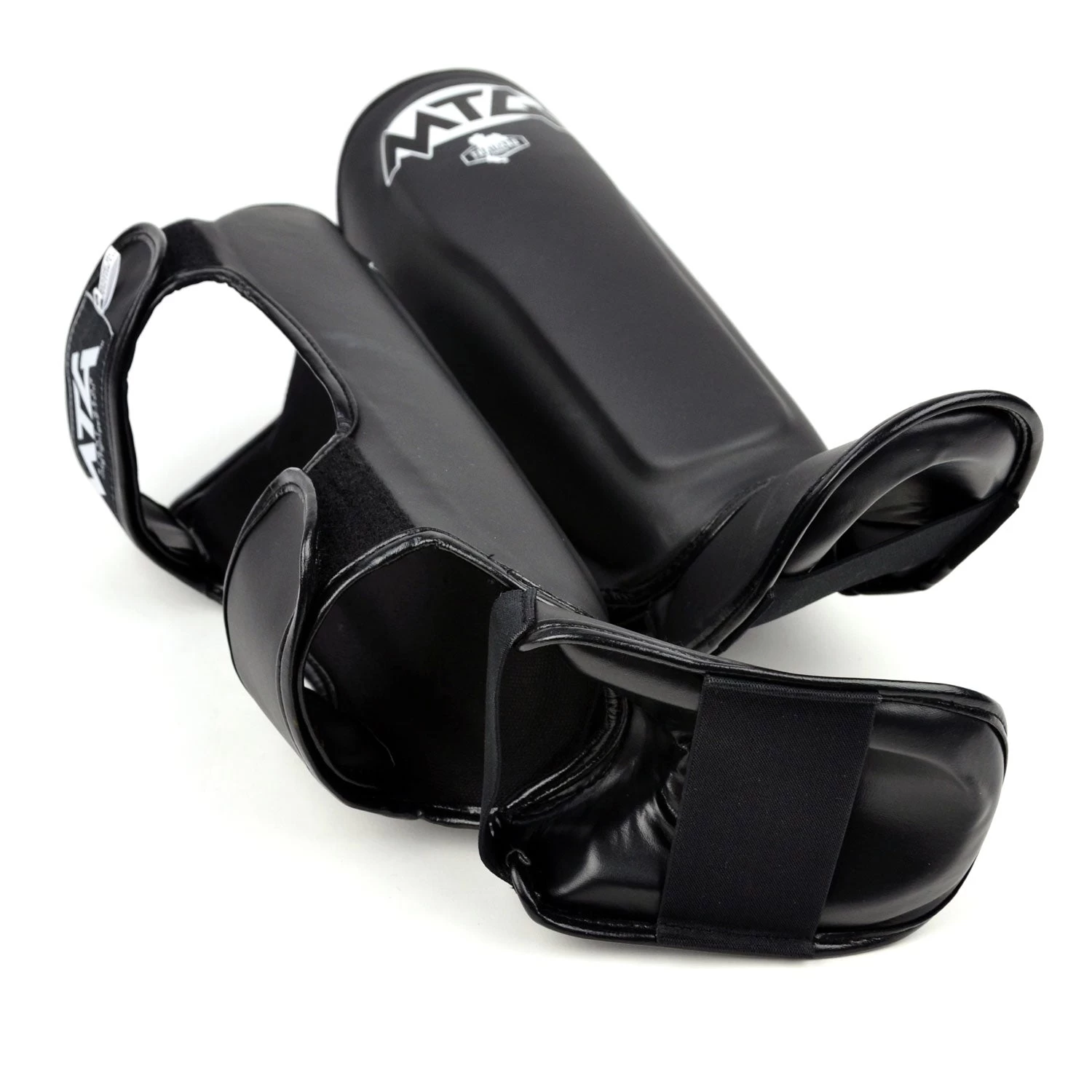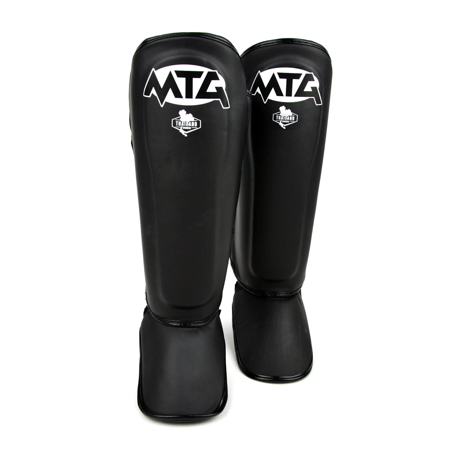 Durable synthetic Thai style shin pads from MTG Pro with good foot coverage for maximum protection when sparring.
