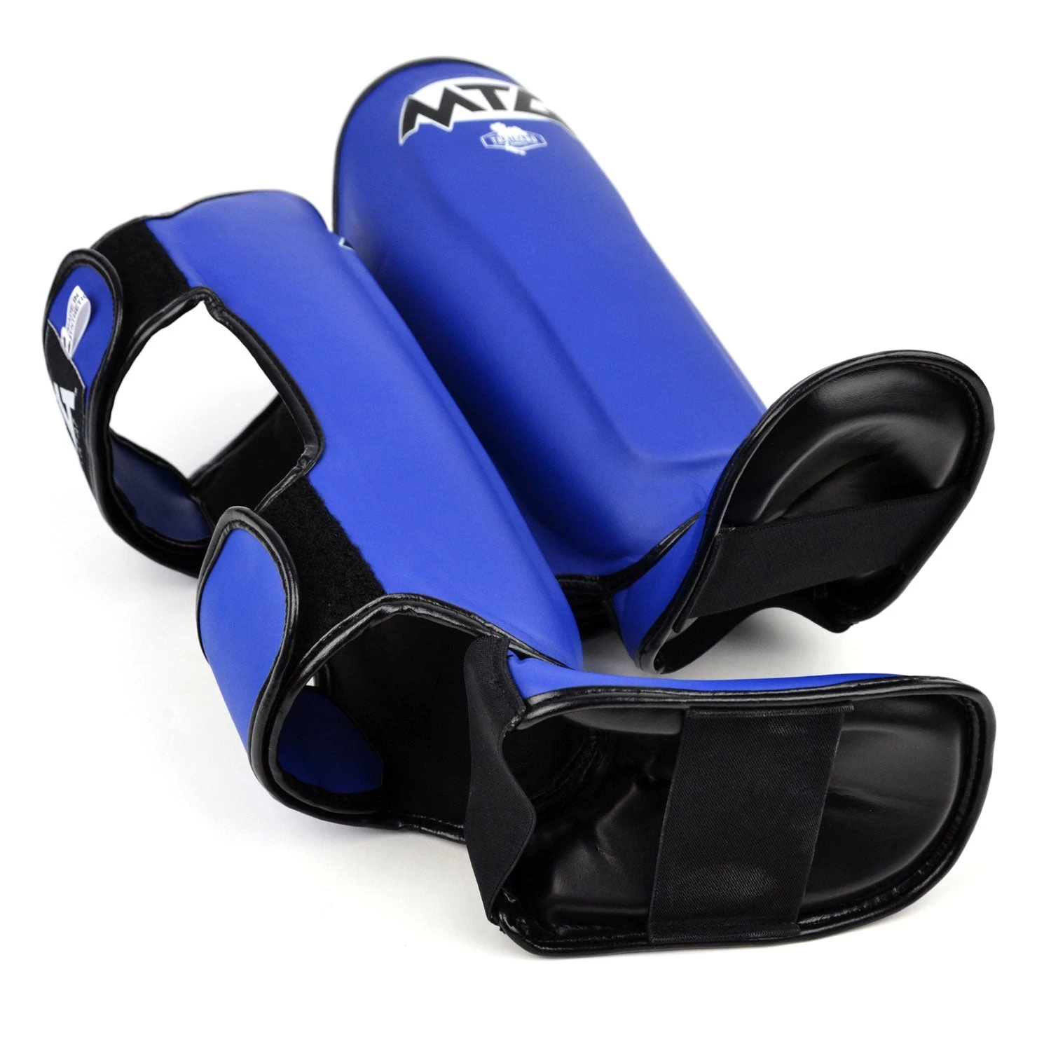 Durable synthetic Thai style shin pads from MTG Pro with good foot coverage for maximum protection when sparring.