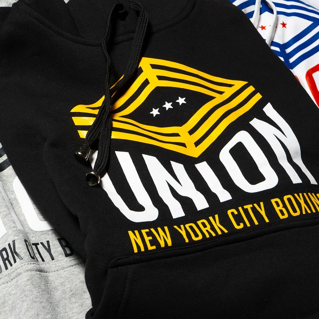 Essential cotton-jersey pullover hoodie with a front kangaroo pouch pocket. Slim-fitting, sleeveless, and breathable design. Stylish Union Boxing Logo on the hood and the chest.